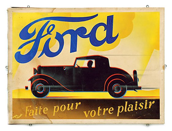 | An original gouache on canvas by Roger Perot for Ford Automobiles, circa 1920's. The painting was for an ad in France. It has since been published in the bible of Automobilia PoulainsL'artde Automobile. |
