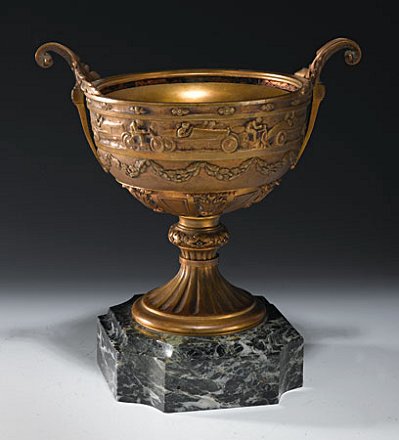 | During the hNine of Art Deco, Edmond Etling operated a world-famous Parisian studio that commissioned high-quality works in bronze, ceramics and glass. Here is one such treasure: a chalice-like bronze trophy with two heavily cast friezesone depicting racing cars and motorcycles, the other a continuous pattern of laurel garlandsabove a deeply chased stem and foot, mounted atop a Carrara marble plinth. The exemplary creation has an engraved signature on the foot, "Ste ETLING Editeur." Interestingly, the trophy cup was constructed with the ability to rotate at its base and also one tier up, just below the wreathed friezepresumably for an easier view of the fine artistry |