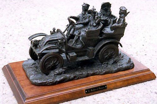 | La Machine de Romance bronze sculpture by Wendy Berg, USA, 1980's, captures a jaunty group out for a spin in an early 1900's touring car similar to a Franklin, signed ed. of 36, 24.25" long with base |