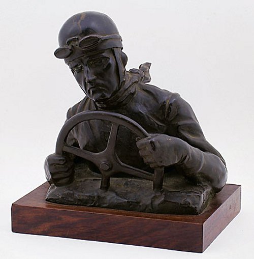 | Among the most well-known French sculptors of the early 20th Century was Ernest Diosi. Perhaps best remembered for his war memorials, his talents did not end with immortalizing fallen soldiers or honoring those who served their country. This particular bronze is just one example of his expertise. Portraying a race car driver intent on winning the race, the 10-1/4" x 7-1/2" bronze is mounted on a hard wooden base and has been signed "E. Diosi" on the lower left side. The logo of the foundry "c F a Paris" is imprinted on to the lower rear base. |