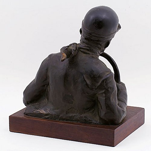 Among the most well-known French sculptors of the early 20th Century was Ernest Diosi. Perhaps best remembered for his war memorials, his talents did not end with immortalizing fallen soldiers or honoring those who served their country. This particular bronze is just one example of his expertise. Portraying a race car driver intent on winning the race, the 10-1/4" x 7-1/2" bronze is mounted on a hard wooden base and has been signed "E. Diosi" on the lower left side. The logo of the foundry "c F a Paris" is imprinted on to the lower rear base.