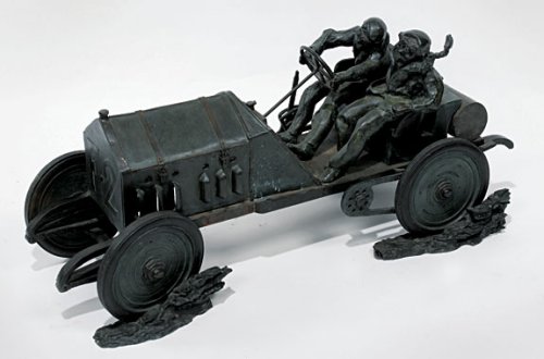| A monumental and important bronze of the Number 2 Fiat car features the immortal Felice Nazzaro driving, who won the grueling Targa Florio race of 1907. It was the second time that he had entered the race and also the second time the event was held. The Targa Florio was established in 1906 by Vincenzo Florio, the son of a wealthy Sicilian family. The race covered a 277-mile course and although only a three lap race of 92 miles per lap, it was a wonder at the time that anyone ever completed it. Not only was the terrain rough and unpaved, but there were no safety barriers to protect one from toppling over the edge of some very high points on the course. This bronze measures 36-1/2" x 17" and was sculpted and cast by an unidentified foundry. |