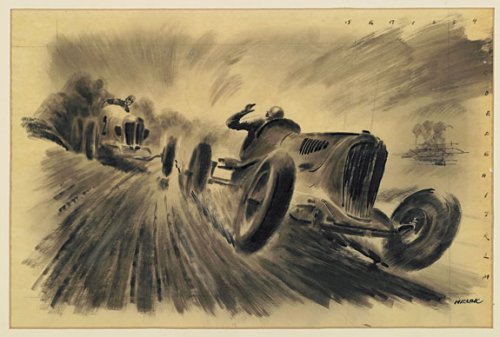 | Peter Helck was born in 1893 and by the age of 13 was attending such events as the Vanderbilt Cup Races of 1906. There is no doubt that Peter Helck was heavily influenced by the work of Ernest Montaut. Helck, like Montaut, was able to capture on paper or canvas the feeling of pure speed, particularly with autos. Without question, Helck is the finest of all American automotive artists, and as such, his work appears in most of the great automotive collections throughout the USA. His book Great Auto Races contains a wealth of the finest depictions of historic races the world over.This artwork was acquired directly from the artist by Charles Schalebaumand subseqeuntly delivered to us. It is a mixed media work on watercolor paper that blends india ink and watercolors to produce a rushing wash of speed lines around two racers, one of whom is passing the other on the inside turn, waving goodbye as he goes. |
