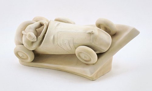 | Presented is a superb matte finished, glazed rendition of an early single seater racing car as it roars on the Brooklands Banked Circuit. It has been signed "Vanca" along the left side of the base. This 15-1/6" x 8" example is a highly important, museum-quality piece of automobile racing history depicting a goggled racing driver desperately trying to control his car at high speed on the famous Brooklands Oval. |