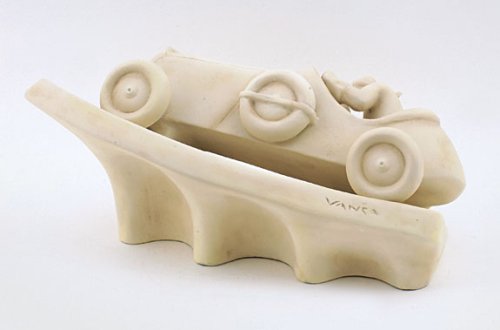 Presented is a superb matte finished, glazed rendition of an early single seater racing car as it roars on the Brooklands Banked Circuit. It has been signed "Vanca" along the left side of the base. This 15-1/6" x 8" example is a highly important, museum-quality piece of automobile racing history depicting a goggled racing driver desperately trying to control his car at high speed on the famous Brooklands Oval.