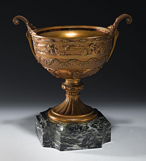 | During the height of Art Deco, Edmond Etling operated a world-famous Parisian studio that commissioned high-quality works in bronze, ceramics and glass. Here is one such treasure: a chalice-like bronze trophy with two heavily cast friezes—one depicting racing cars and motorcycles, the other a continuous pattern of laurel garlands—above a deeply chased stem and foot, mounted atop a Carrara marble plinth. The exemplary creation, measuring 10-1/2" tall and 9-3/4" from handle to handle, has an engraved signature on the foot, "Ste ETLING Editeur." Interestingly, the trophy cup was constructed with the ability to rotate at its base and also one tier up, just below the wreathed frieze—presumably for an easier view of the fine artistry. |