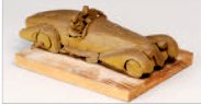 Peter Helck Clay Sculpture of Alfa 2.9 used as model for painting 13x8x41/2 Peter Helck was born in 1893 and by the age of 13 was attending such events as the Vanderbilt Cup Races of 1906. There is no doubt that Peter Helck was heavily influenced by the work of Ernest Montaut. Helck, like Montaut, was able to capture on paper or canvas the feeling of pure speed, particularly with autos. Without question, Helck is the finest of all American automotive artists, and as such, his work appears in most of the great automotive collections throughout the USA. His book Great Auto Races contains a wealth of the finest depictions of historic races the world over.This artwork was acquired directly from the artist by Charles Schalebaumand subseqeuntly delivered to us. It is a mixed media work on watercolor paper that blends india ink and watercolors to produce a rushing wash of speed lines around two racers, one of whom is passing the other on the inside turn, waving goodbye as he goes. |