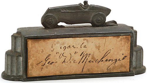 | Well known sprint car driver George "Doc" MacKenzie was inducted into the National Sprint Car Hall of Fame in 1994. MacKenzie drove in 7 Indy 500 races and died at the age of 30 in 1936 in a sprint car race. This is a sort of cast metal paper weight (5" wide) with a photo of MacKenzie on one side and an original autograph of MacKenzie pasted on the other. The rare autograph has some skips. |