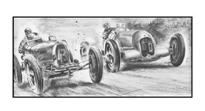 | This artwork is featured in the book "The Big Race" page number 64 1934 "Grand Prix of Germany" Luigi Fagioli - Mercedes passes Durand - Bugatti Charcoal on paper 38 5/8" x 17 1/8" 1934 "Grand Prix of Germany" Luigi Fagioli - Mercedes passes Durand - Bugatti Charcoal on paper 38 5/8" x 17 1/8" featured in “The Great Race” |